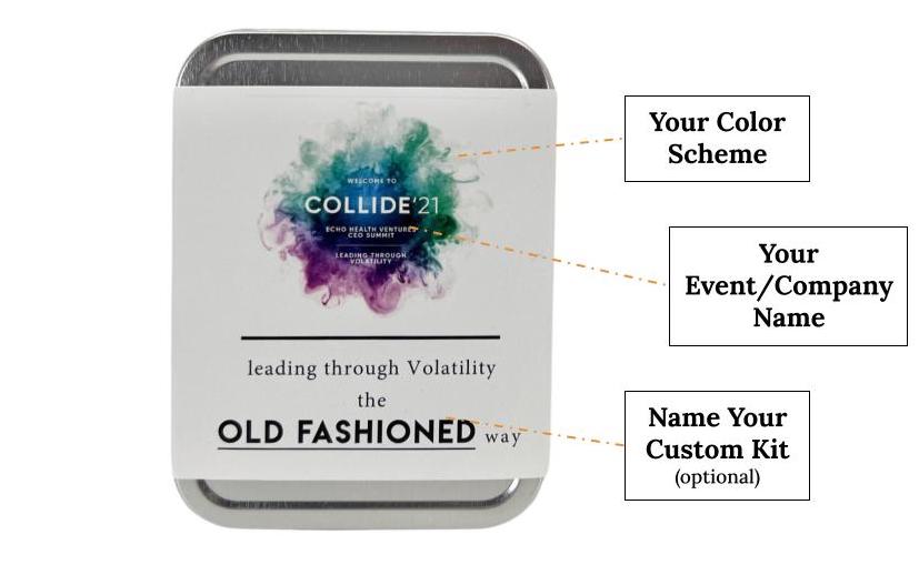 We have customized thousands of our signature cocktail kits for companies of all sizes. While you are not required to customize (you can purchase them with our original packaging), we do encourage you to feature the name of your business or event, as this is sure to have the biggest impact on your valued employees and/or clients.