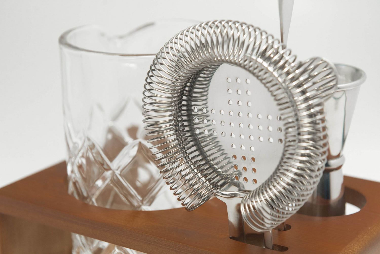 QUALITY MIXING TOOLS – Our Crystal Glass Cocktail Stirring kit comes with 1 Crystal Mixing Glass, a Hawthorne Strainer, Stirring Spoon, Stainless Steel Jigger and Wood Stand